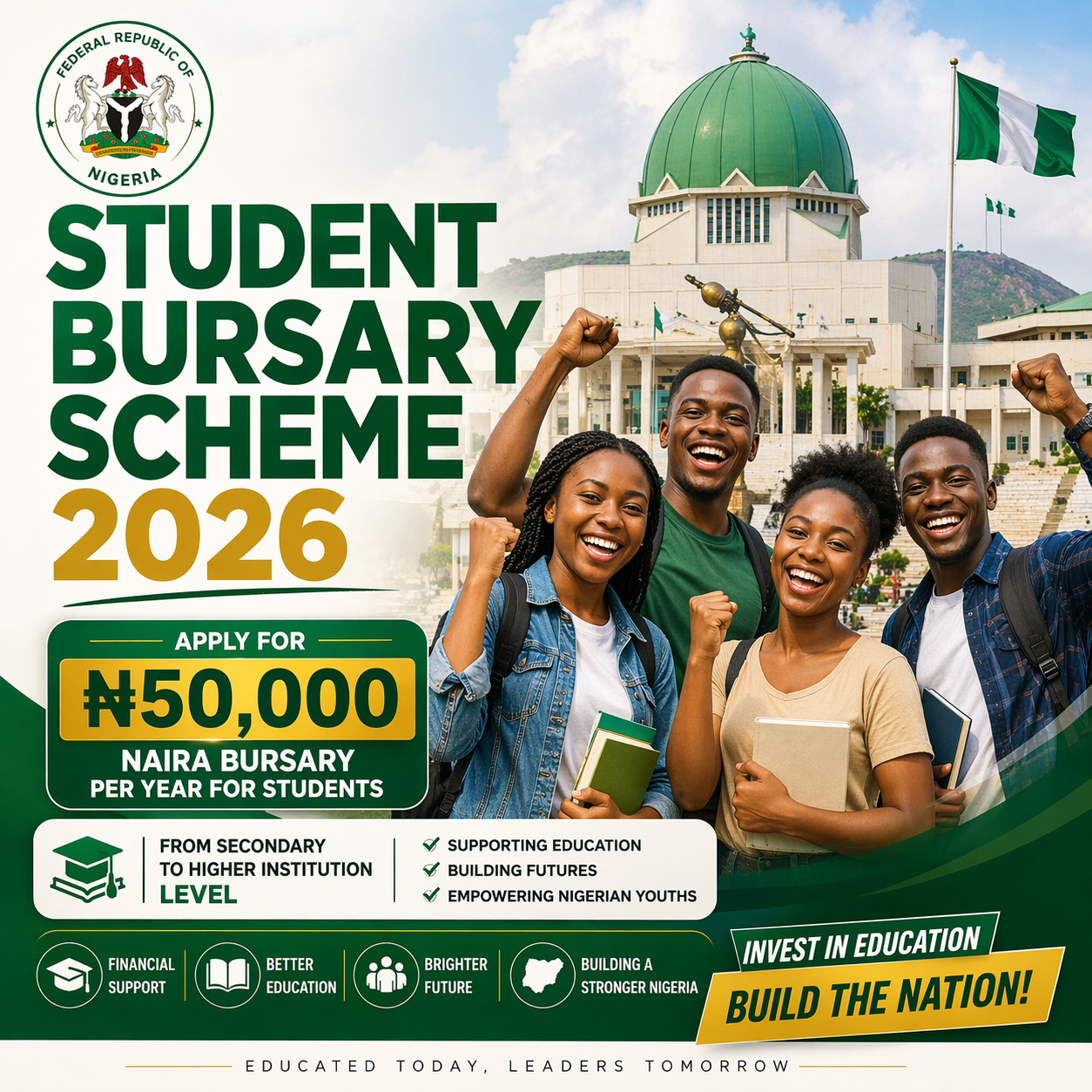 The Application process for ₦50,000 STUDENTS BURSARY 2026 SCHEME is currently ongoing, This initiative aims to provide financial assistance to all Students from Secondary level to Higher Institution. To take advantage of this opportunity, Click on the "Apply Now" below to fill the Application Form.